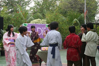 I just happened finding this photo when I looked at Mom's album. A photo when I was middle-school dancing Bon Odori. At that time I joined Japanese Language extracurricular. For Art Performance, the teacher, Frita-sensei, the one who was also my guide during my two weeks holiday in Japan, taught us Bon Odori. Because it's already been a long time I forget the Bon Odori.